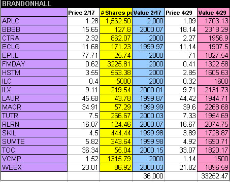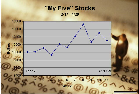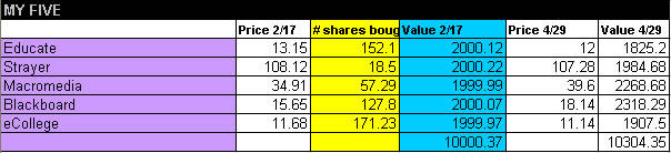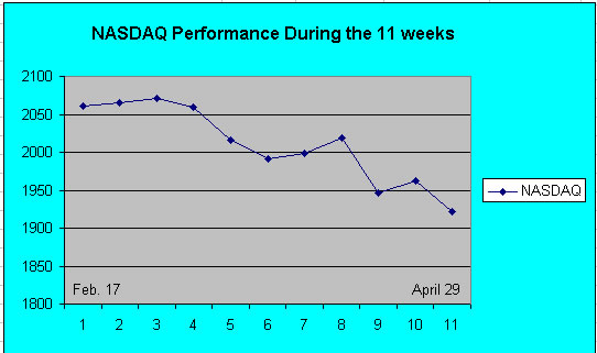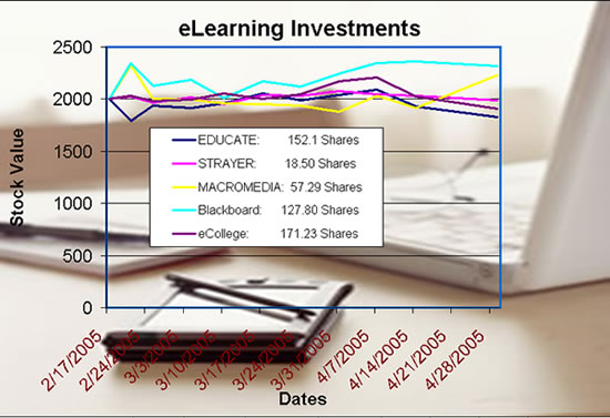 I tracked their value weekly for 11 weeks. On Feb. 17, the stocks were worth $10,000.37. On April 29, they were worth $10,304.35. The stocks as a group experienced a 3.04% growth in 11 weeks. This was due to the increase of Blackboard and Macromedia. I compared these stocks with the performance of NASDAQ and all the eLearning stocks listed on the Brandon Hall site. During the 11 weeks: